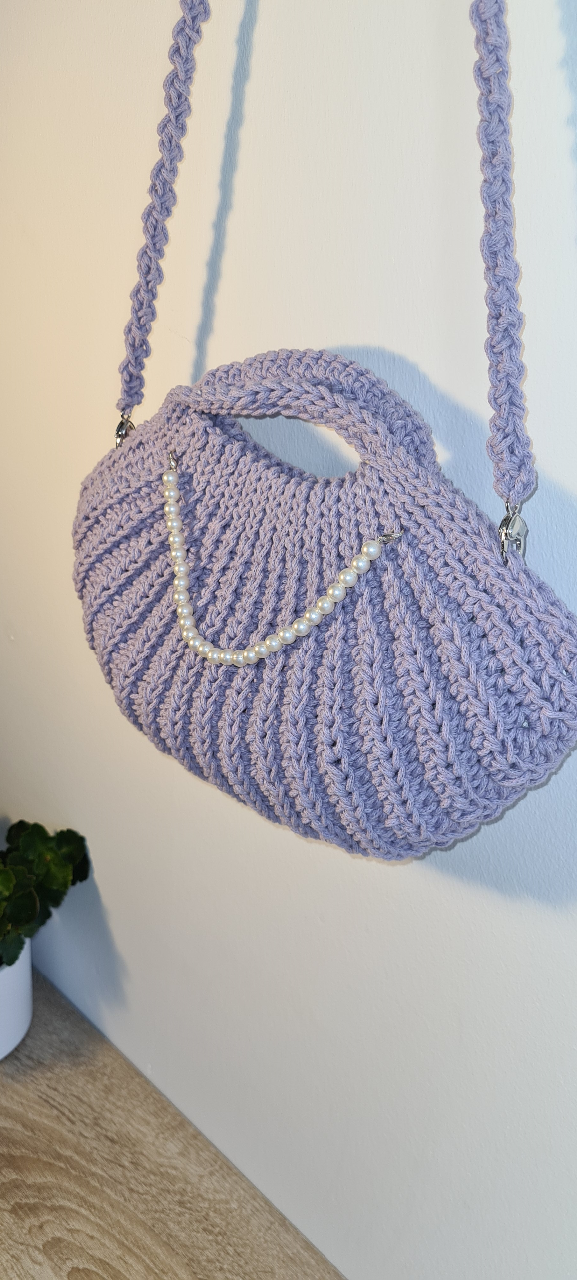 Anyaga: lila zsinórfonal, bélése fehér selyem.